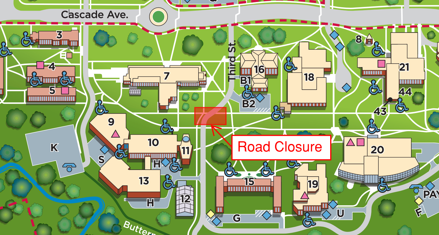 In addition to building locations, the map highlights parking areas, bike racks, and walking paths. This information is invaluable for planning your route, ensuring you arrive at your destination efficiently.